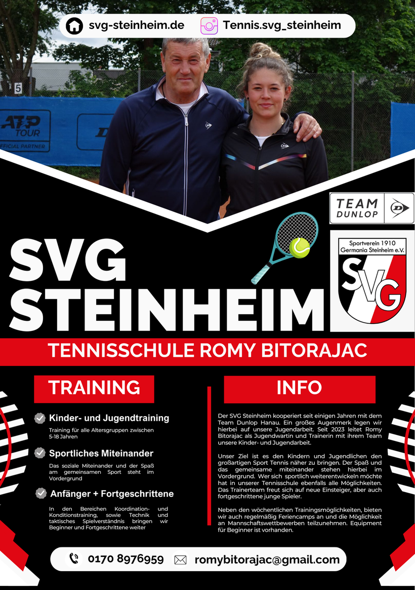 Der SVG Steinheim kooperiert seit einigen Jahren mit dem Team Dunlop Hanau. Ein großes Augenmerk legen wir hierbei auf unsere Jugendarbeit. Seit 2023 leitet Romy Bitorajac als Jugendwartin und Trainerin mit ihrem Team unsere Kinder- und Jugendarbeit.